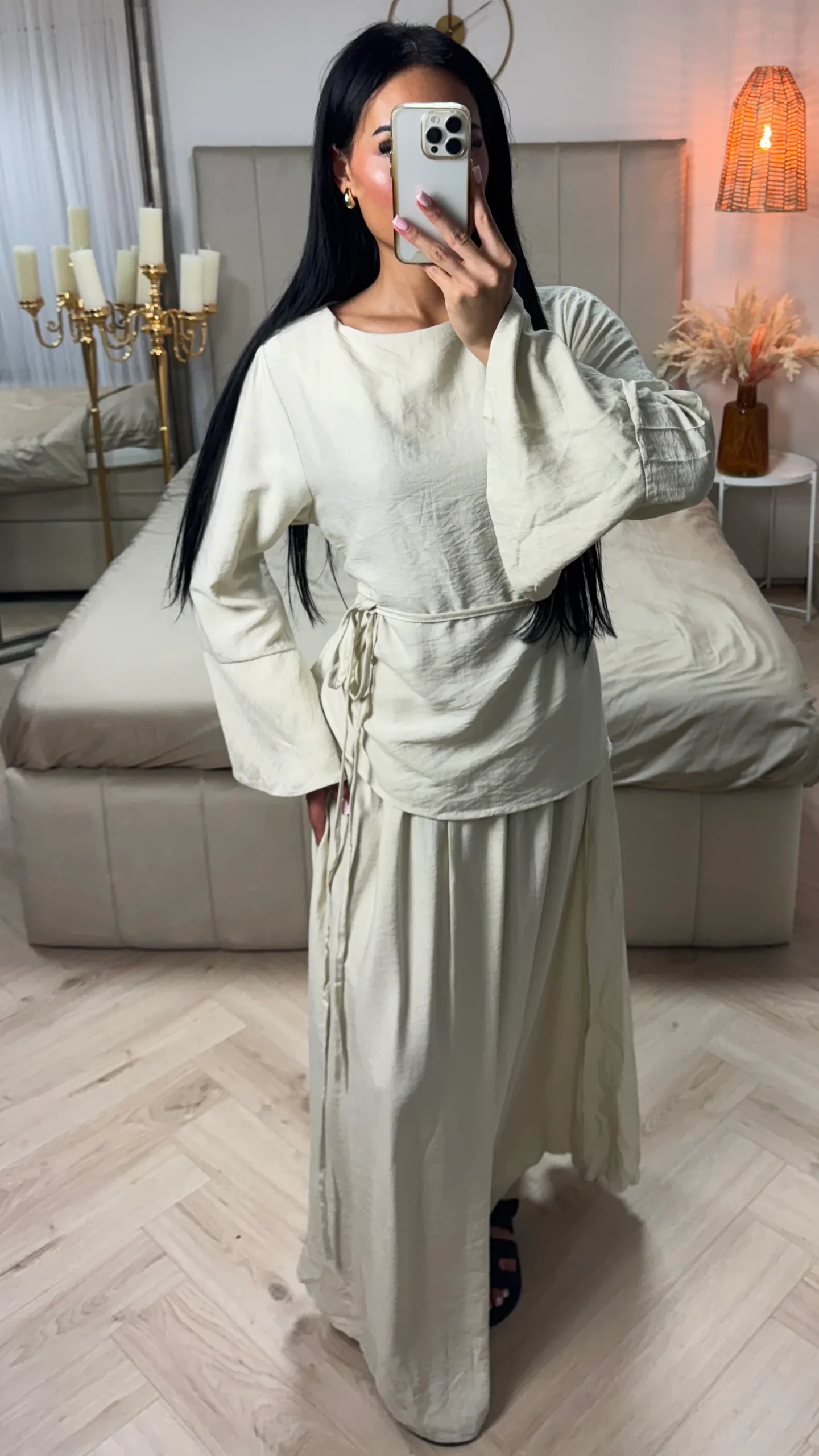 Deze luchtige 2-delige set combineert comfort met een vrouwelijke uitstraling. De top heeft een ceintuur die je taille mooi accentueert en de rok valt soepel langs het lichaam. Perfect voor warme dagen of een stijlvolle, casual outfit.