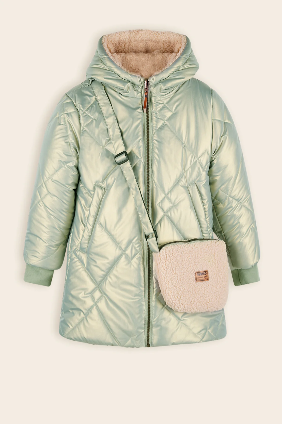 De NONO Betty Reversible Winterjas met Tasje Groen is een echte blikvanger met een verrassende extra: een bijpassend tasje dat de look compleet maakt. Deze halflange jas is niet alleen praktisch, maar ook super stylish – met twee verschillende kanten om mee te variëren.
