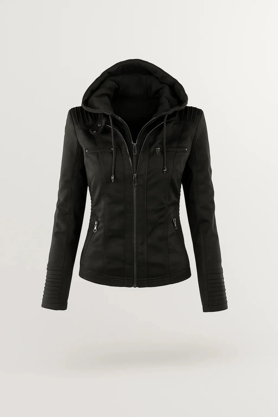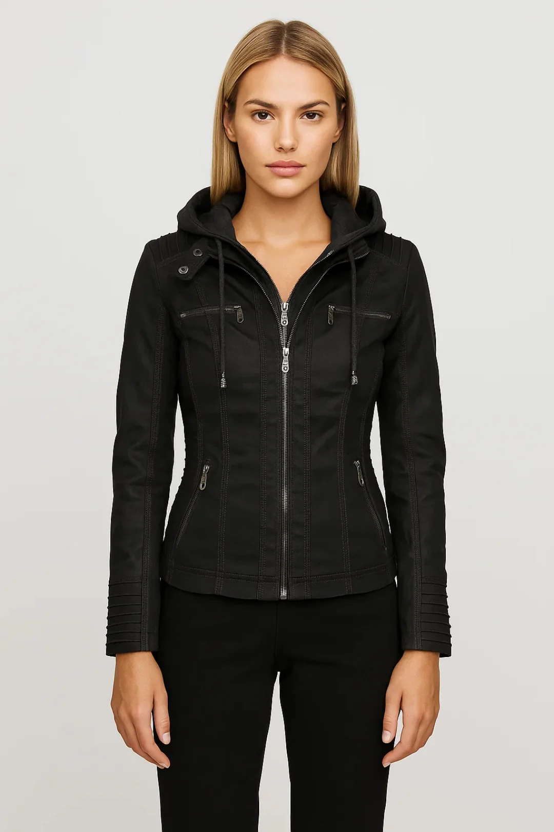 Deze getailleerde bikerjas is de perfecte combinatie van een robuuste uitstraling en een elegante pasvorm. De afneembare capuchon geeft extra veelzijdigheid, terwijl de ritsdetails zorgen voor een moderne look.