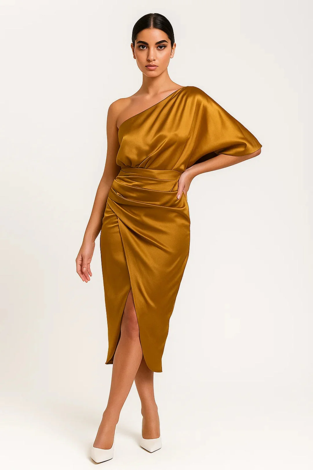 • Kenmerken: One shoulder design, asymmetrische afwerking, geplooid detail