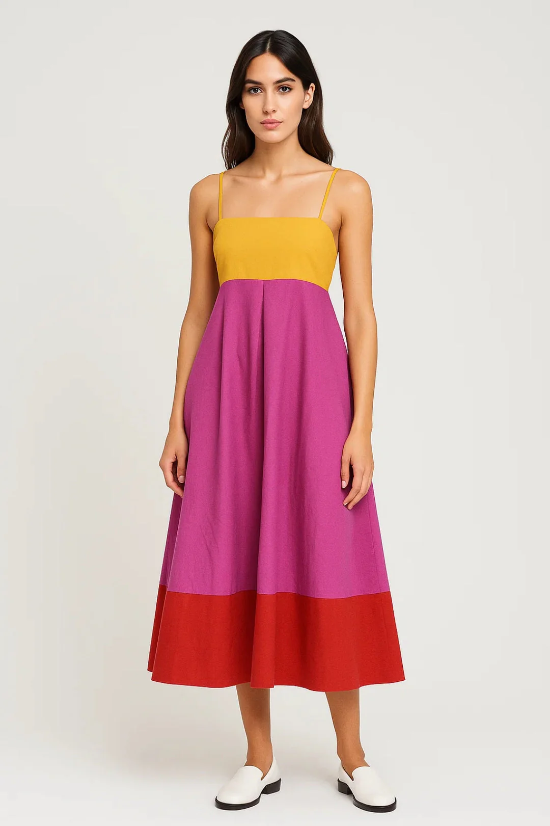 Deze jurk heeft een recht bovenstuk met smalle bandjes en loopt vanaf de taille soepel uit tot een midi-lengte. De strakke lijnen aan de bovenkant worden mooi in balans gebracht door de wijde, vloeiende rok.