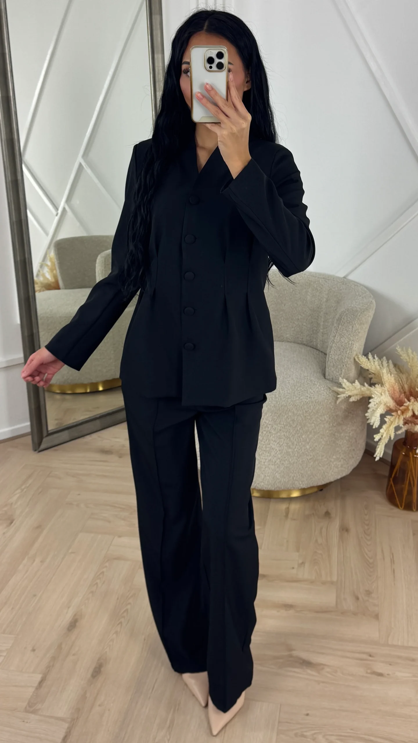 Deze elegante two-piece blazer set straalt klasse en eenvoud uit. De gevoerde blazer zorgt voor een mooie pasvorm en een luxe uitstraling, terwijl de soepele pantalon met wijde pijpen het geheel afmaakt. Ideaal voor zowel zakelijke als stijlvolle gelegenheden. Combineer met pumps voor een sophisticated look of met loafers voor een moderne twist.