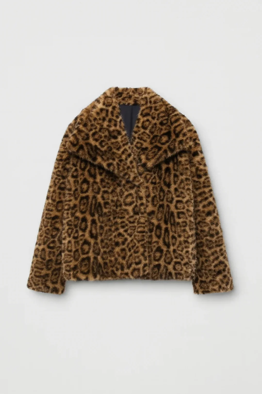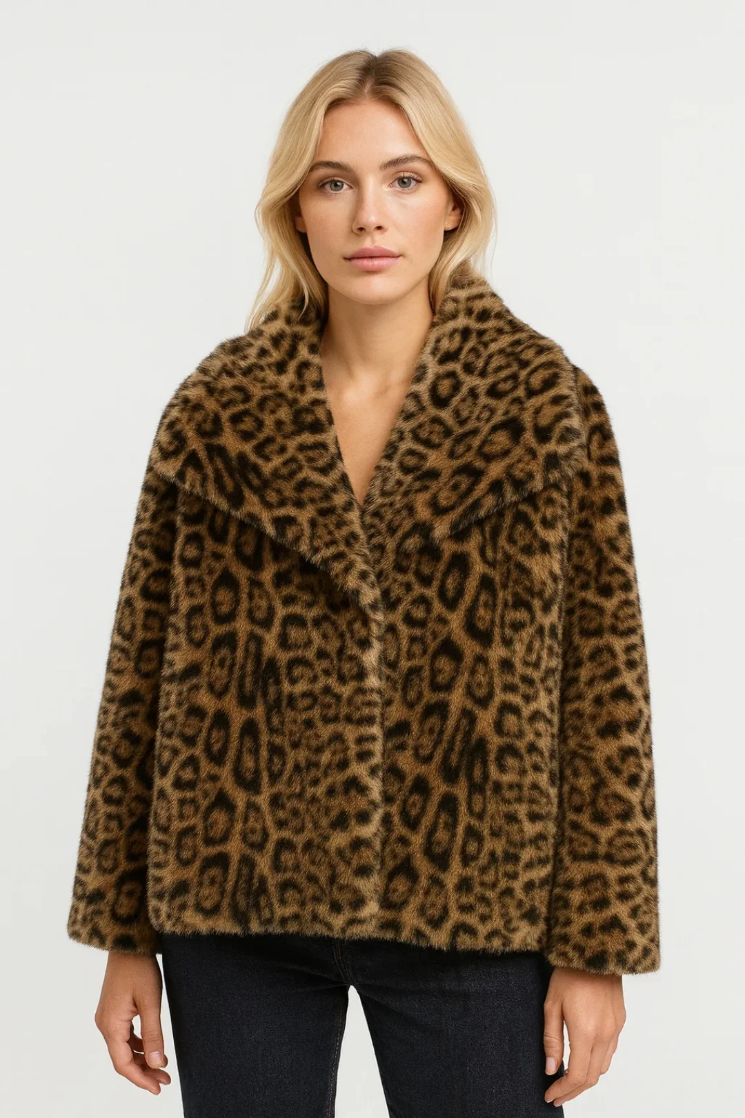 Deze korte damesjas in imitatiebont met opvallende panterprint is de perfecte eyecatcher voor koude dagen. De zachte textuur en volumineuze kraag zorgen voor comfort, terwijl het patroon een krachtige fashionstatement maakt.
