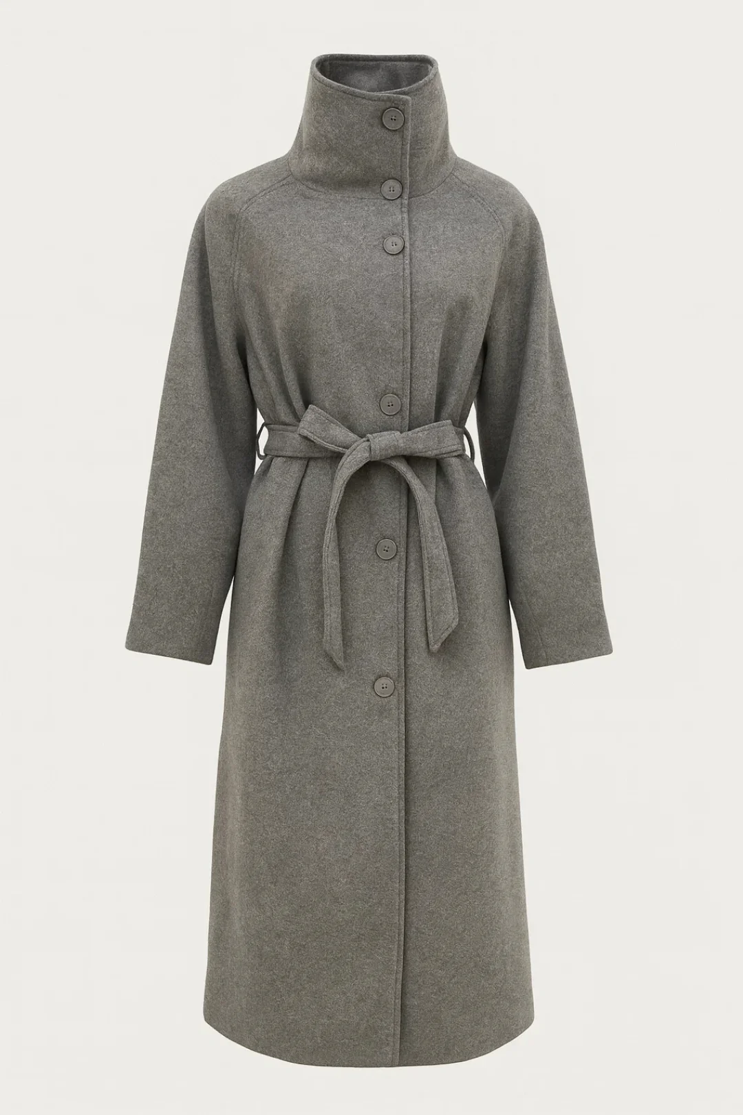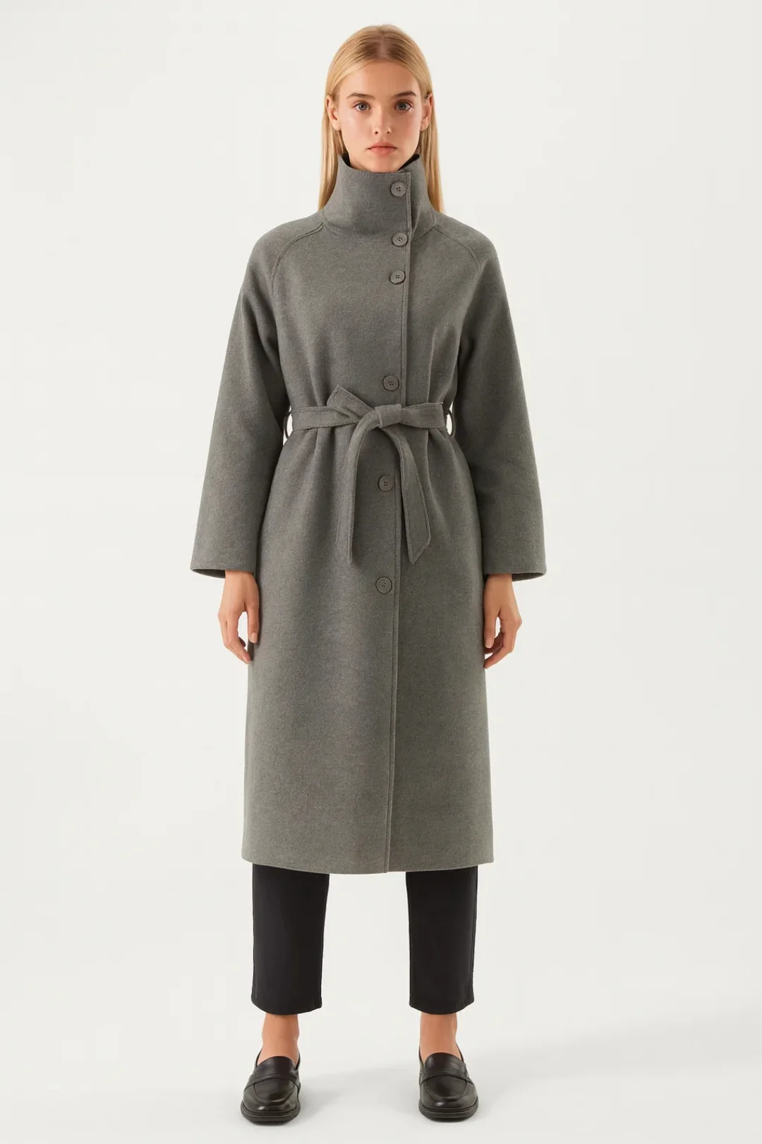 Deze lange damesjas combineert een moderne, strakke snit met een functionele ritssluiting en bijpassende tailleceintuur. De verhoogde kraag en asymmetrische knoopsluiting geven het ontwerp een subtiel architecturaal karakter.