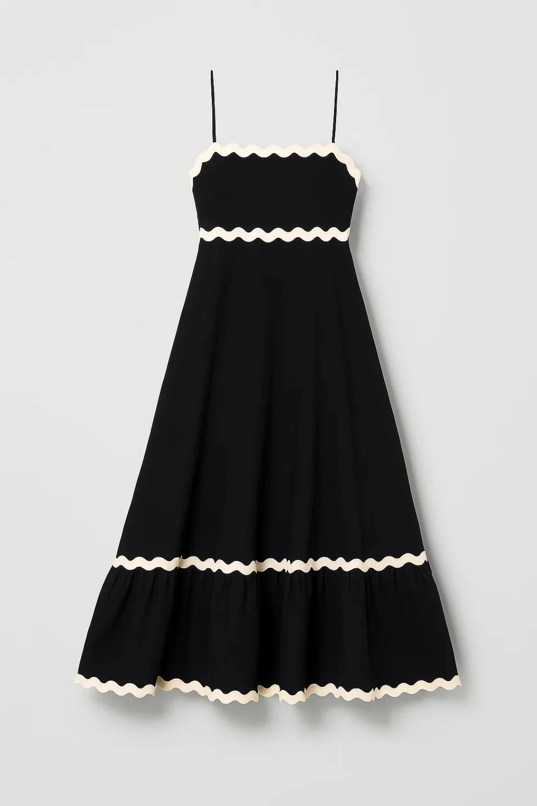 Deze maxi jurk heeft dat onweerstaanbare zomerkarakter waarbij elke detail klopt, van de slanke spaghettibandjes tot de sierlijke golvende rand die de jurk afwerkt. De gelaagde rok met volant onderaan geeft haar extra beweging en een speels, vrouwelijk silhouet. Perfect voor warme zomerdagen, een strandvakantie of elk moment waarop je er moeiteloos chic uit wilt zien.