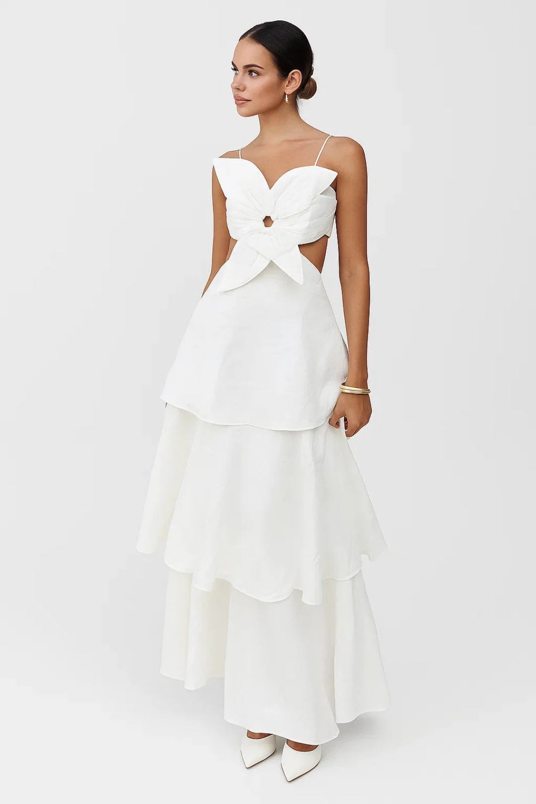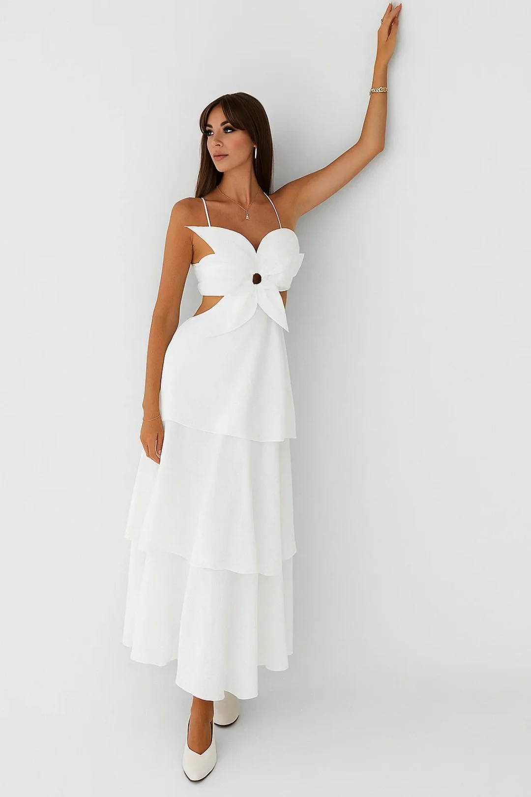 Deze maxi jurk is een architecturaal meesterwerk in modeform, gedurfd, vrouwelijk en absoluut onvergetelijk. Het gedraaide knoopdetail op het bovendeel, de cut-outs aan de taille en de drielaagse rok met scalloprand geven haar een sculptuurachtige uitstraling die je op geen enkele bruiloft of zomers gala onopgemerkt laat. Een jurk die niet alleen een outfit is, maar een statement.