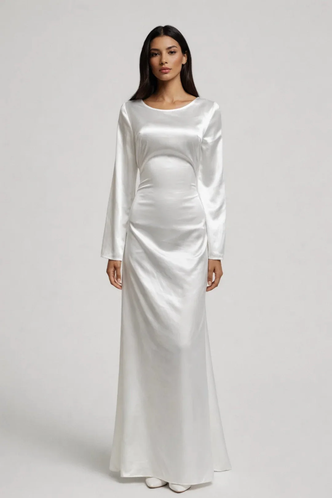 Deze lange jurk sluit mooi aan op het lichaam en benadrukt het silhouet op subtiele wijze. De lange mouwen en de vloeiende lengte zorgen voor een stijlvolle look die geschikt is voor formele momenten en bijzondere gelegenheden.
