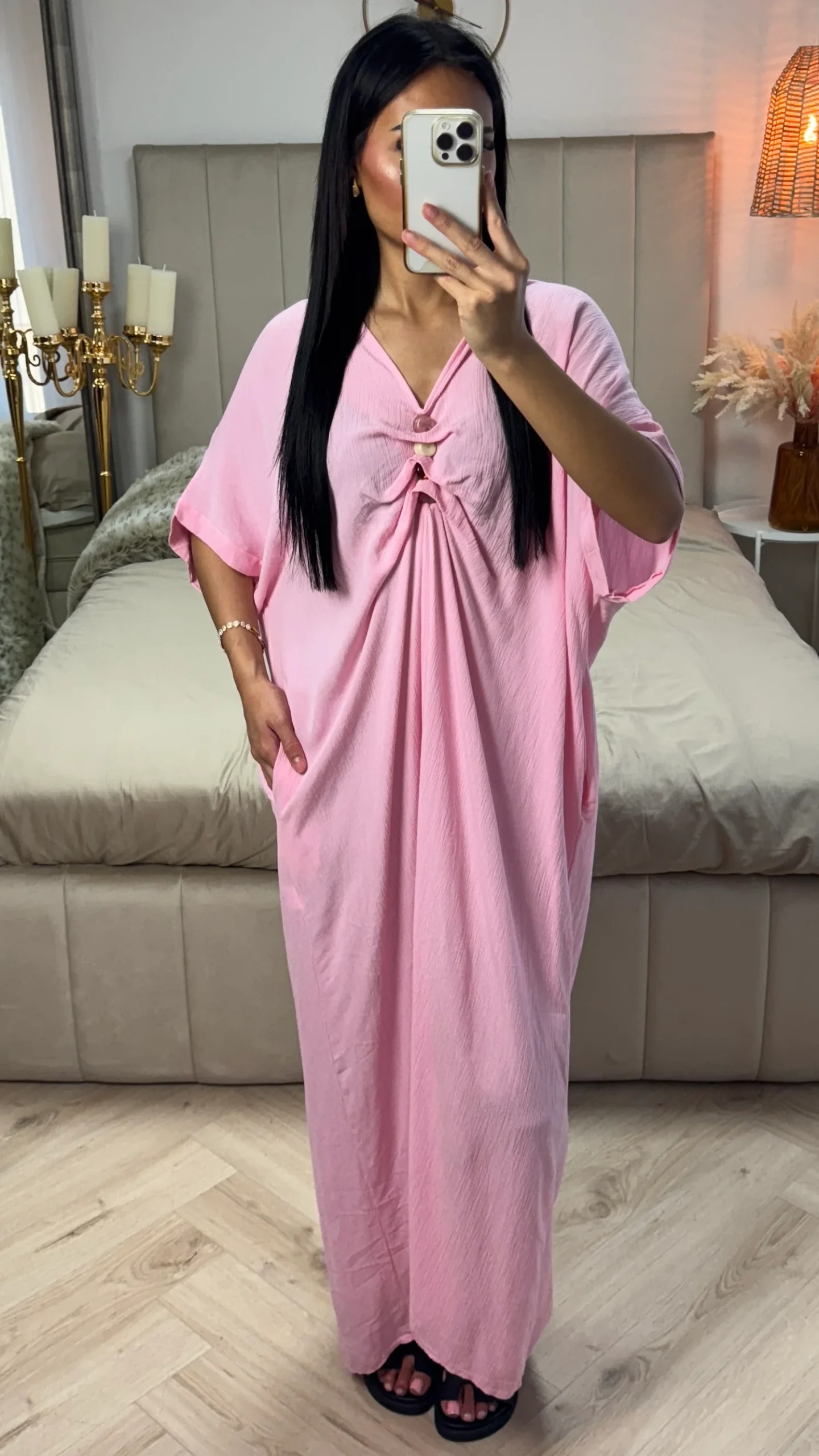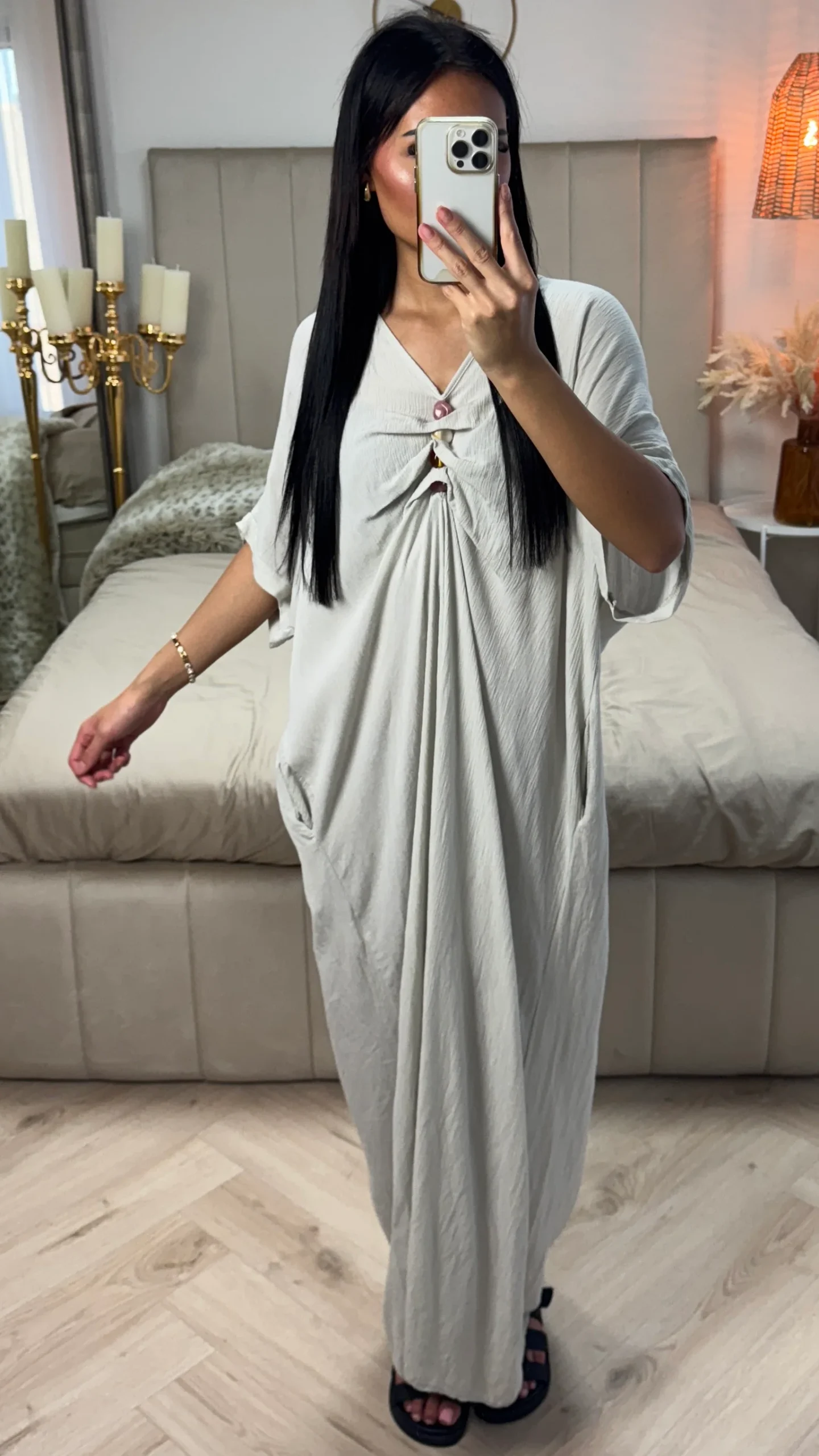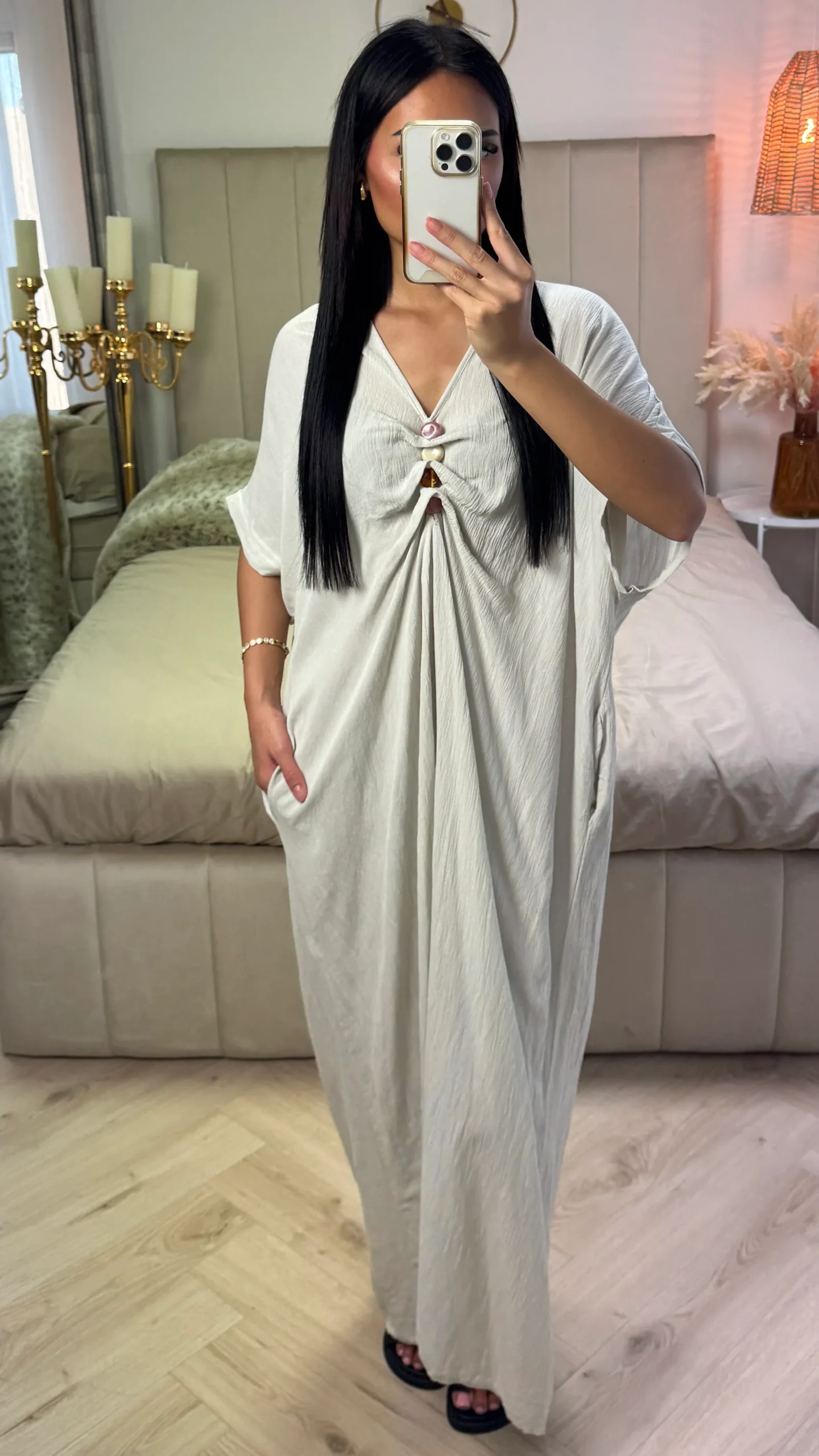 Deze luchtige maxi jurk van 100% viscose combineert comfort met een opvallend detail: het geplooide voorpand met drie stijlvolle sierknopen. De ruime fit zorgt voor een flatterend silhouet dat heerlijk zit op warme dagen. Perfect voor dagelijks gebruik, een diner of een zomerse gelegenheid.