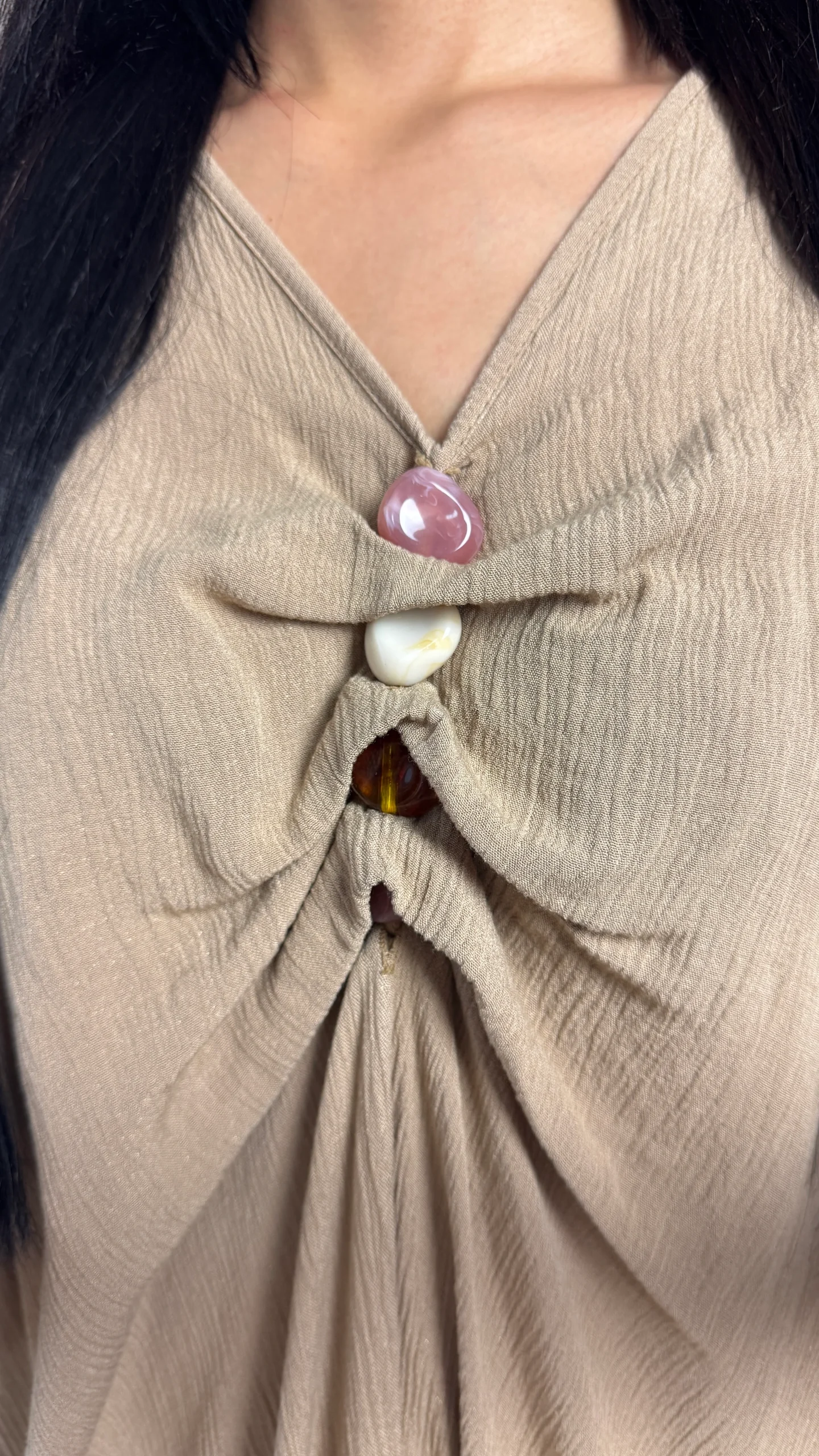 – Uniek geplooid front met decoratieve knopen