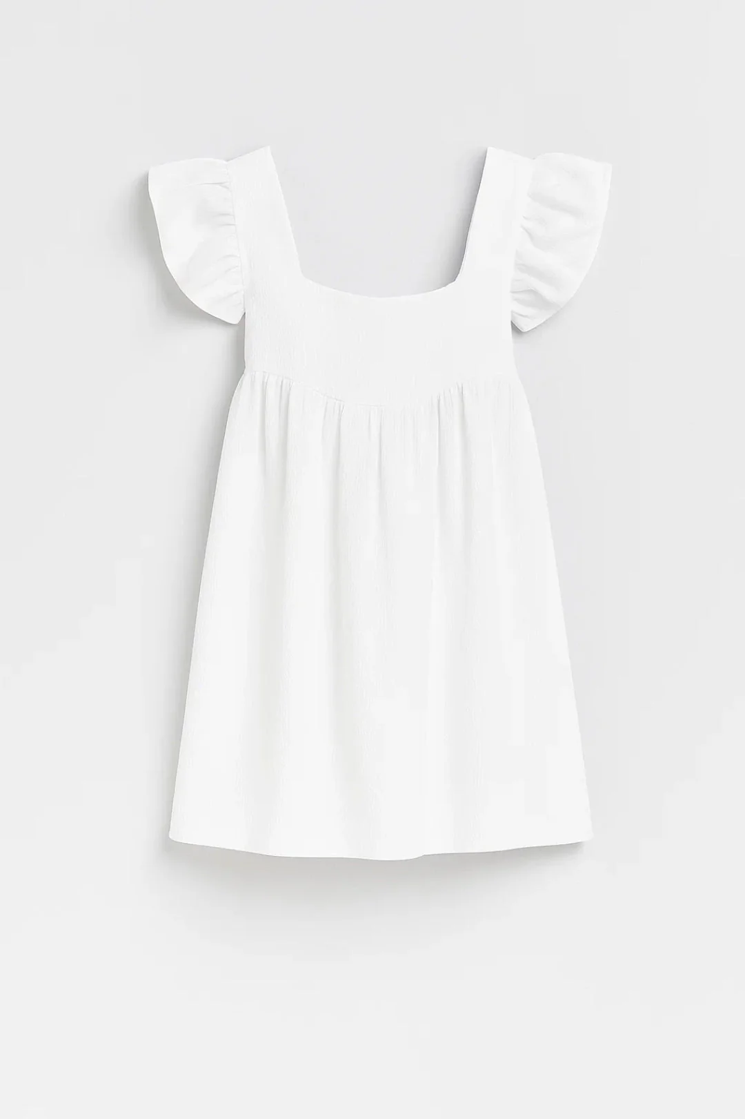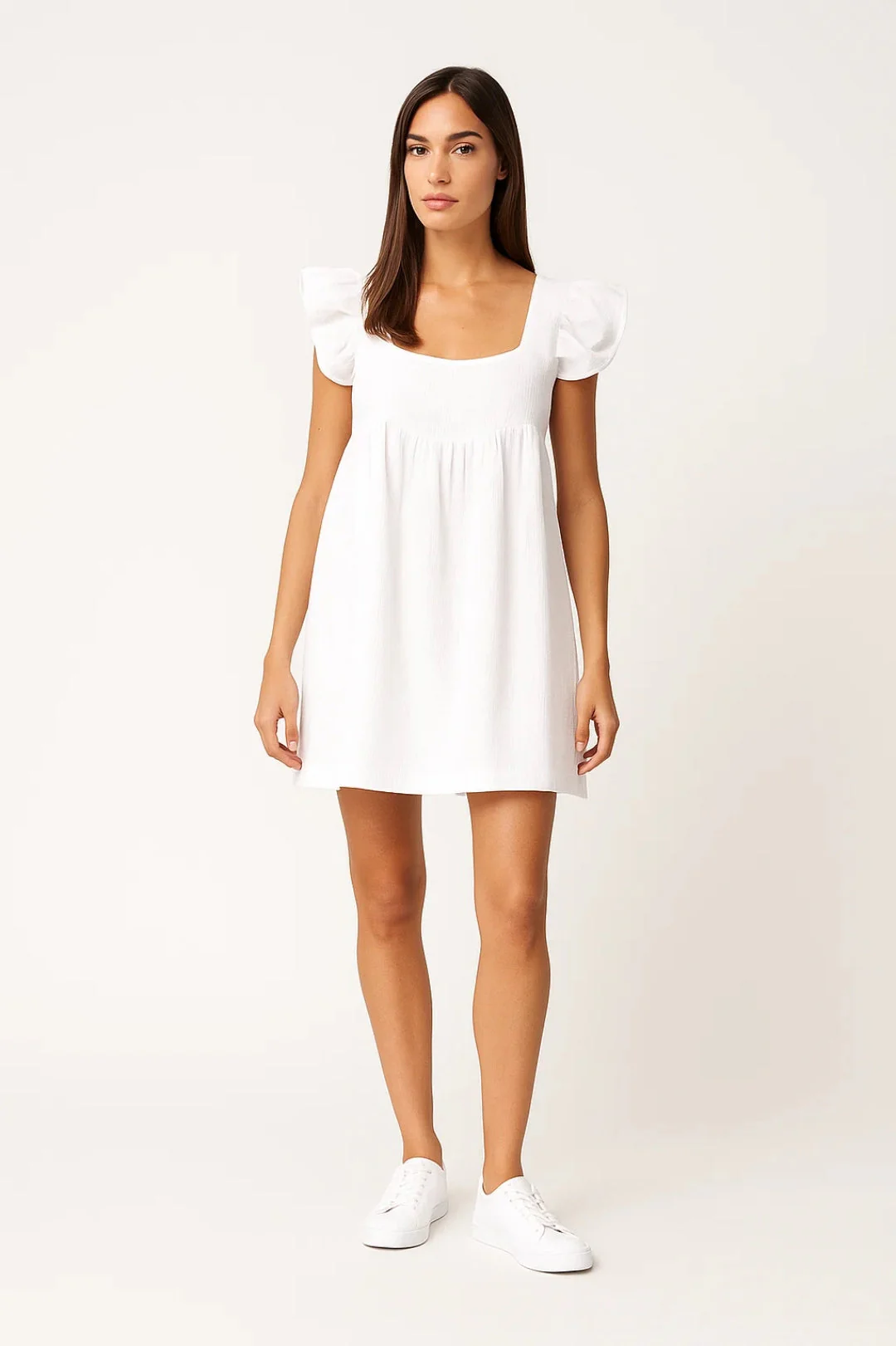 Deze mini jurk heeft de zorgeloze zomerse charme die je look op slag frisser en vrolijker maakt. De luchtige babydoll pasvorm gecombineerd met de speelse ruffle mouwtjes en de vierkante hals geeft haar een romantisch en vrouwelijk karakter dat perfect past bij warme dagen. Draag haar met sneakers voor een casual dagelijkse look of met sandaaltjes voor een zomers feestje.