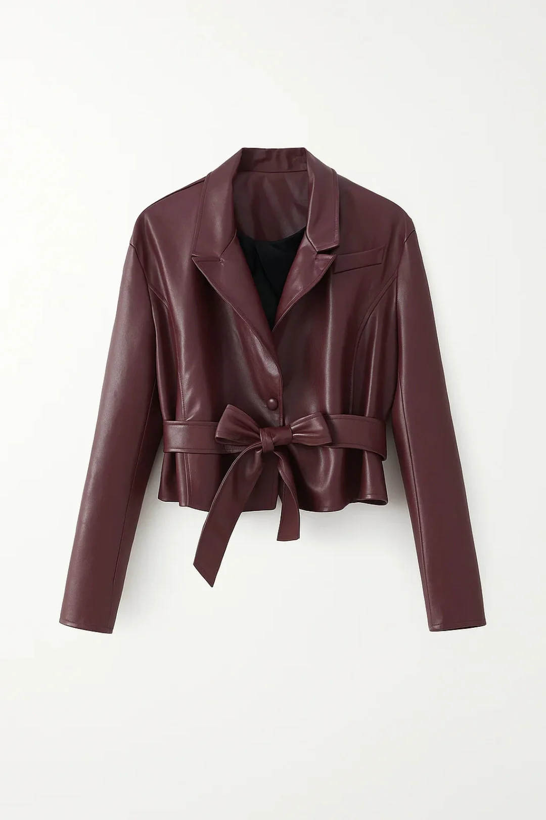 Deze getailleerde blazer met strikceintuur creëert een elegant silhouet en benadrukt de taille op subtiele wijze. Het glanzende oppervlak en de diepe kleur geven een luxe uitstraling – ideaal voor herfstige avonden of formele momenten.