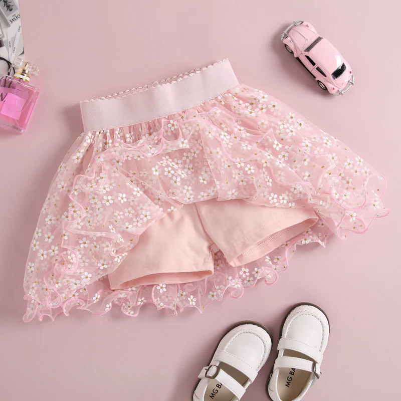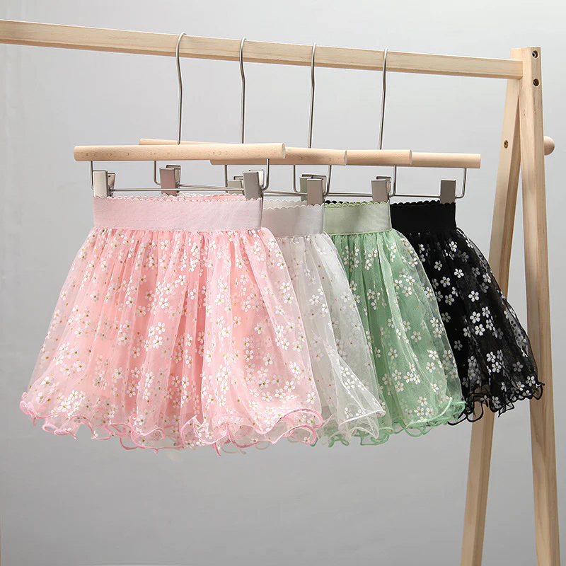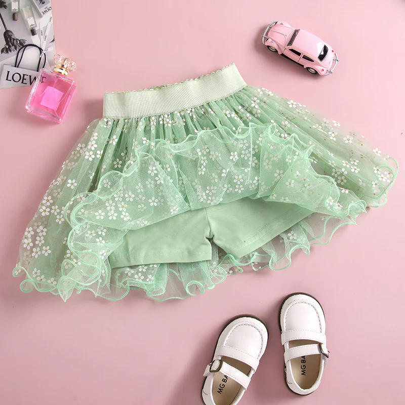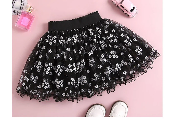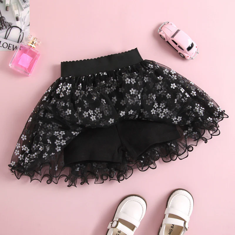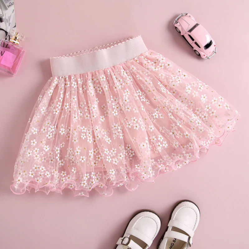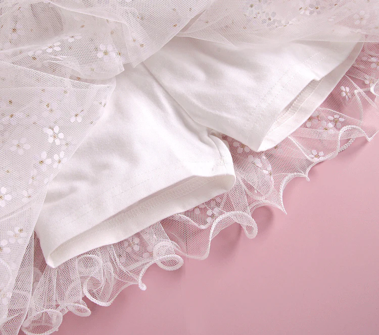 Dit rokje heeft een vrolijke print van witte bloemetjes met een gouden hartje, en is gemaakt van 2 lagen tule met daaronder een katoenen broekje.