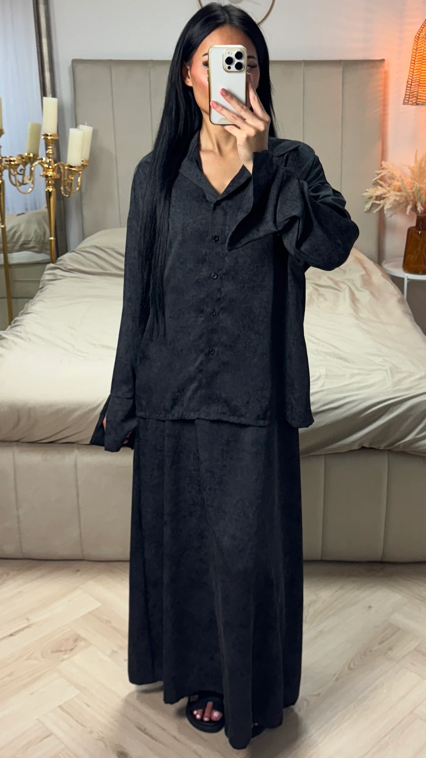 Deze tweedelige set oogt luxe en draagt heerlijk. De blouse met splitmouwen geeft een moderne, elegante touch, terwijl de mouwloze maxi jurk soepel valt. Draag ze samen voor een complete look, of mix & match met je favoriete items voor elke dag of een speciale gelegenheid.